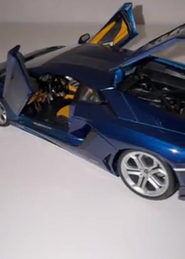 static close-up of a blue Lamborghini Aventador toy model on a white surface. The toy car has its doors open, revealing a yellow and black interior. The trunk of the model is also open, showing internal mechanics. The camera rotates slightly to show the back of the car, where the Aventador label is visible. The car appears to be in good condition. The background is plain and out of focus.