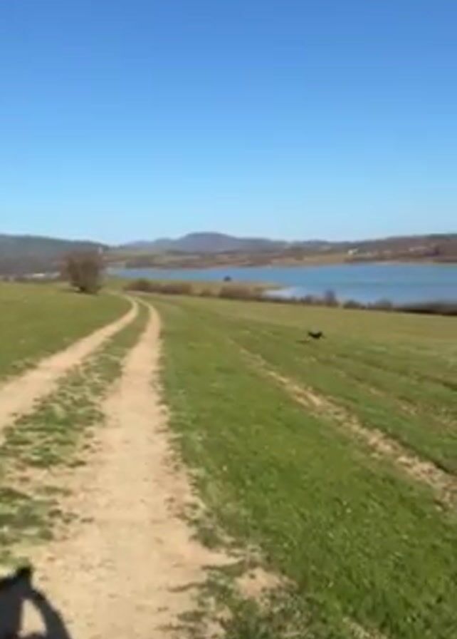 dirt road with green grass on either side, leading towards a lake under a bright blue sky. Mountains are visible in the background. A dog runs across the grass towards the lake. A person's hand and arm are briefly visible in the lower left corner of the frame.
