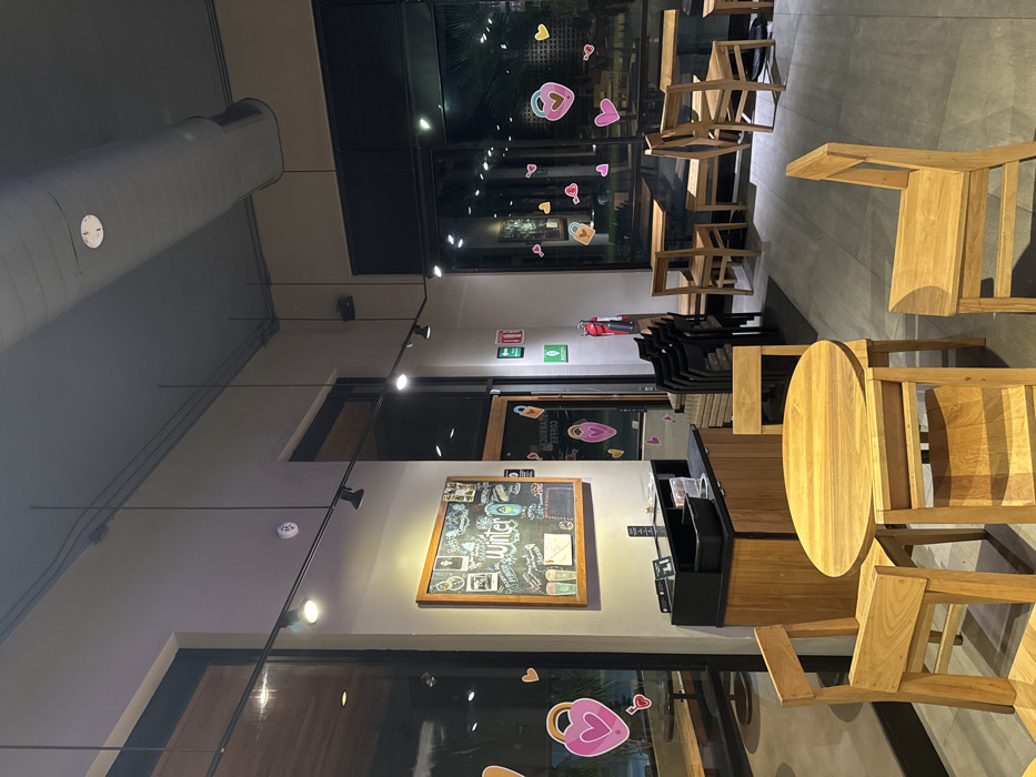 An indoor scene features wooden tables and chairs in a café or restaurant setting. A large chalkboard with illustrations and text hangs on the wall. Windows are decorated with heart and lock-shaped stickers. Overhead, a long ventilation duct runs along the ceiling. Track lighting illuminates the interior. Stacked chairs are visible near a door. The space appears modern and somewhat spare.