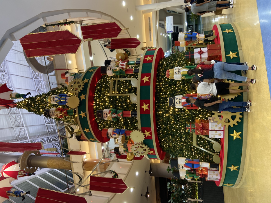 A tall, decorated Christmas tree stands in a large indoor space, likely a shopping mall. The tree is adorned with lights, nutcrackers, gears, and musical notes. Banners hang from the ceiling. Several people are standing near the base of the tree, possibly taking pictures. The surrounding floor is brightly lit and appears to be a light yellow or gold color.