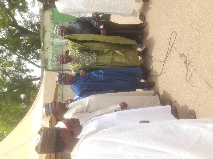 A group of men, all wearing traditional clothing and head coverings, stand in a loose circle in front of a tan tent. The man in the center of the group is holding a microphone. The men are standing on a gravel surface. The coordinates provided place the scene in the city of Gusau, Nigeria. There is a tan tent behind the men, and a green building to the right of the men. There is a long black cord on the ground in front of the men. A third man, wearing a white robe, is standing just behind the man with the microphone. The man with the microphone is in the middle of speaking. The man to the left of the man with the microphone is wearing a brown robe, and the man to the right of the man with the microphone is wearing a green robe. There is a tree to the left of the men. There is a white object in the tree, possibly a speaker or a light.