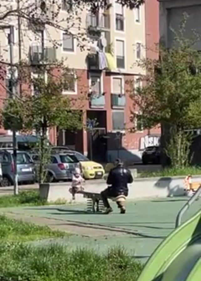 A small child in a light pink jacket rides a seesaw with an adult figure in a black jacket and brown pants, in an outdoor playground with a green surface. The playground includes a green slide in the foreground. In the background are multi-story residential buildings with various colors and architectural styles, as well as parked cars and greenery. The day appears bright with sunlight casting shadows in the playground.