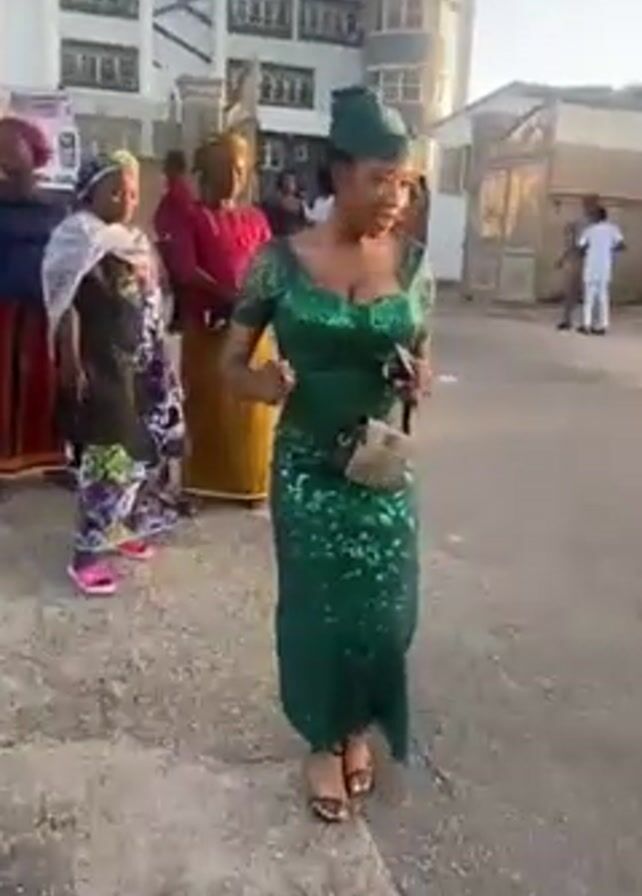 The video captures a woman in a shimmering green dress and matching headwear, standing outdoors with a small black purse. She is surrounded by other women, some of whom are wearing traditional African attire. The woman in green walks closer to the camera, turns around, and smiles, as if she is posing for the video. Behind her, other people are visible in the background, suggesting the presence of a gathering. The setting appears to be a paved area near a building with multiple floors. The overall tone of the video is celebratory, given the woman's dressy attire and interactions.