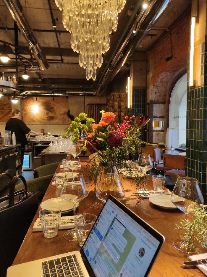 This image depicts the interior of Tartarbar restaurant, located at Marata Street 57, Saint Petersburg, Russia. This identification is based on the reversed text "ТАРТАР РЕСТОРАН" (Tartar Restaurant) visible on a reflective surface within an arched alcove on the right wall, corroborated by the distinctive interior design. The scene focuses on a long, polished wooden communal table extending from the foreground into the midground. This table is meticulously set with multiple place settings, each comprising a white circular plate, a clear stemmed wine glass, a clear faceted water tumbler, and silver cutlery (fork and knife). A large, vibrant floral centerpiece, arranged in a clear glass vase, is positioned centrally along the table, featuring green foliage, bright orange flowers, and red berries. In the immediate foreground, a silver-colored laptop is open, displaying a messaging application with green and white chat bubbles. In the midground to the left, a person with light-colored hair, wearing a dark short-sleeved top, is visible behind a stainless-steel service counter, actively organizing numerous clear glasses. Further into the background, other dining tables and chairs are visible, mostly unoccupied, with a few indistinct figures faintly discernible. The restaurant's interior design blends industrial and rustic elements. The ceiling features exposed dark metallic ductwork and recessed spot lighting. A prominent, multi-tiered chandelier, constructed from numerous clear glass teardrop-shaped elements, hangs centrally overhead. The walls display sections of distressed red brickwork interspersed with dark green square tiling. The aforementioned arched alcove on the right wall contains a reflective surface. The space is well-lit, combining ambient light, focused illumination, and the chandelier's glow.