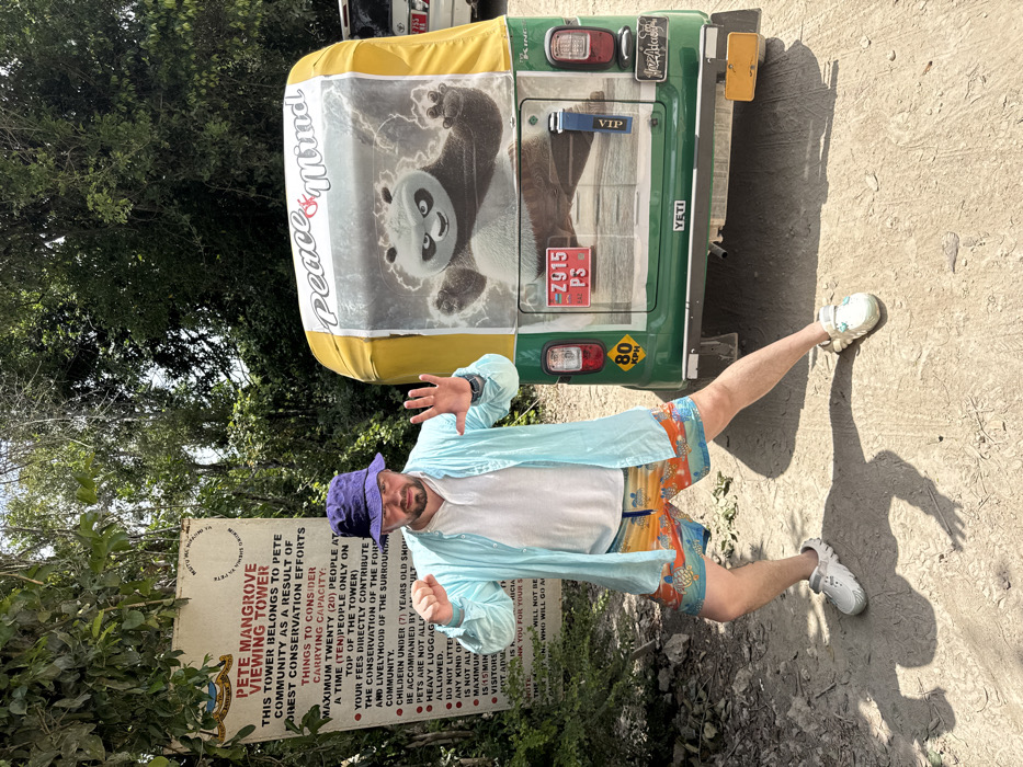An adult male stands on a dirt path in Jozani, Tanzania, near a wooden sign indicating the "Pete Mangrove Viewing Tower