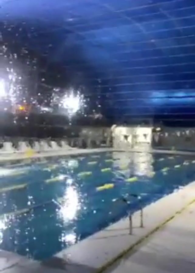 n indoor swimming pool with a bright blue tiled ceiling. The pool is rectangular and divided into several lanes with yellow markers. The water is clear and still, with reflections of the ceiling lights. The pool deck is light grey, and there are some yellow safety cones visible. In the background, a person can be seen walking near the edge of the pool, but they are far away and not clearly defined. The overall lighting is bright, with some glare from the overhead lights. The camera pans slightly, providing a view of the full length of the pool.