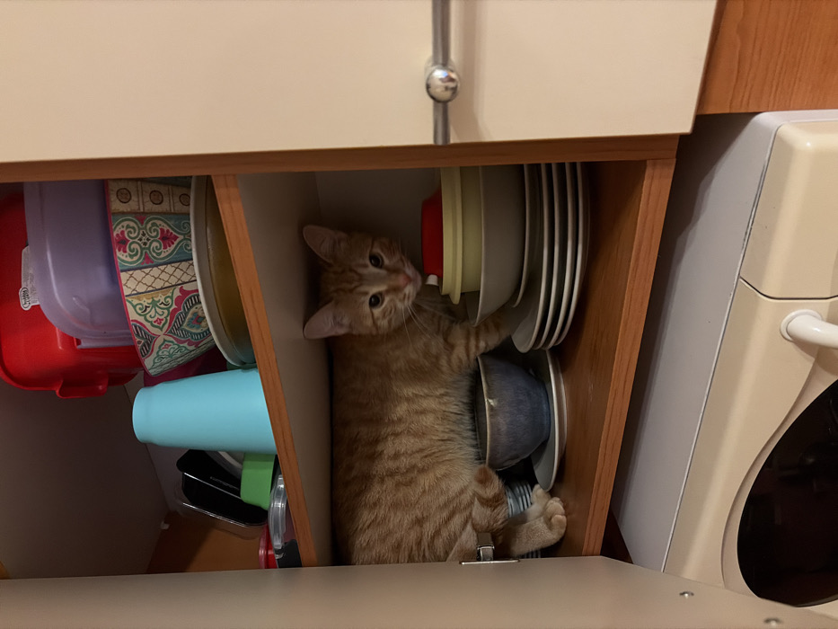 - "An orange tabby cat is observed inside an open kitchen cabinet in a residential interior" by FM-NjaWW2, licensed under CC BY 4.0