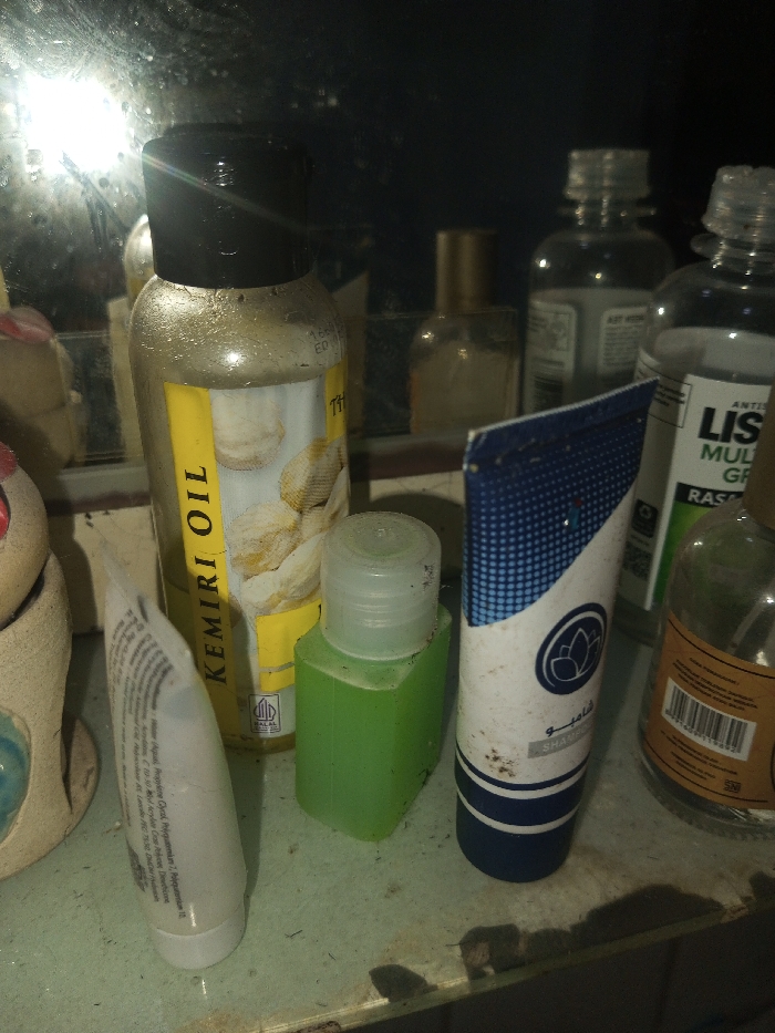 n assortment of toiletries crammed onto a shelf, partially reflecting in a mirror behind. Prominently featured are a bottle of Kemiri Oil, a small green bottle, and a blue and white tube labeled "SHAMPOO." Other items include Listerine, a perfume bottle, and several unidentified clear bottles, all covered in grime and dust. The cluttered arrangement suggests a cramped bathroom or storage space.