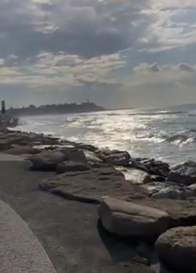 seascape with waves crashing against a rocky shoreline. The sky is cloudy, with the sun trying to peek through, creating a glimmering effect on the water. A paved path runs alongside the rocks. In the distance, the silhouette of a coastal town or island can be seen, with a lighthouse standing out. There are no people visible in the video.