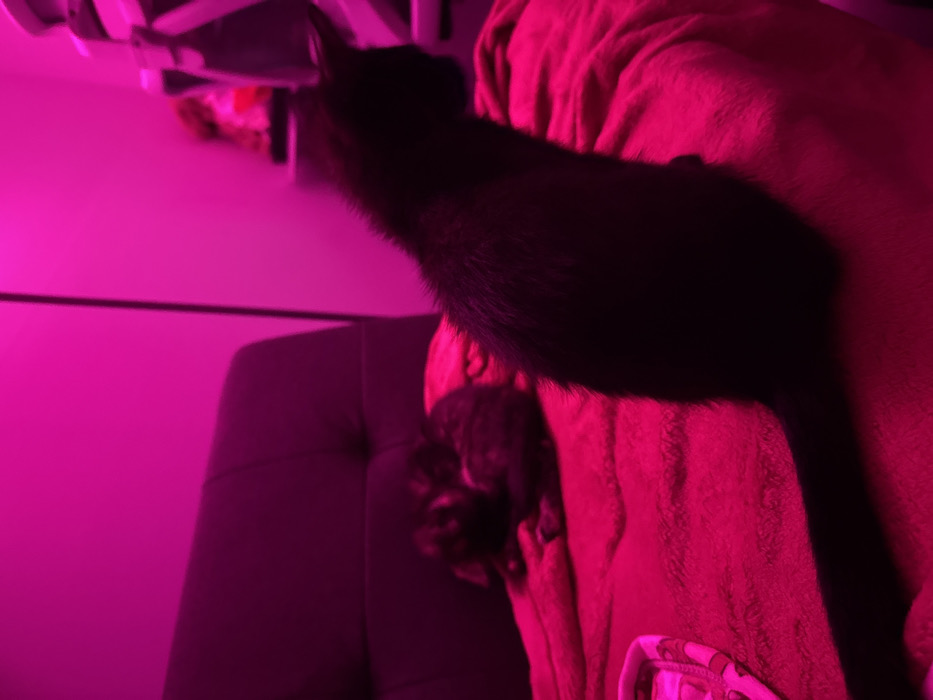 The scene depicts an indoor domestic setting, specifically an area with furniture and bedding, located in the city of Miami, United States of America. The entire environment is saturated with a strong pink or magenta artificial light, which dictates the perceived colors. In the mid-right foreground, a dark-furred cat, appearing black, is seated, facing away from the camera and looking towards the right of the frame. Its long tail extends diagonally downwards to the lower-left. Adjacent to this cat, slightly to its left and further back on a textured, bright magenta blanket, a second cat is curled into a resting position. This second cat's fur shows mottled dark brown, black, and grey patterns, its true coloration obscured by the ambient light. In the left background, a dark upholstered surface, possibly a headboard or a chair back with button tufting, is visible. The right background contains blurred, lighter-colored vertical furniture or shelving. No people are visible.