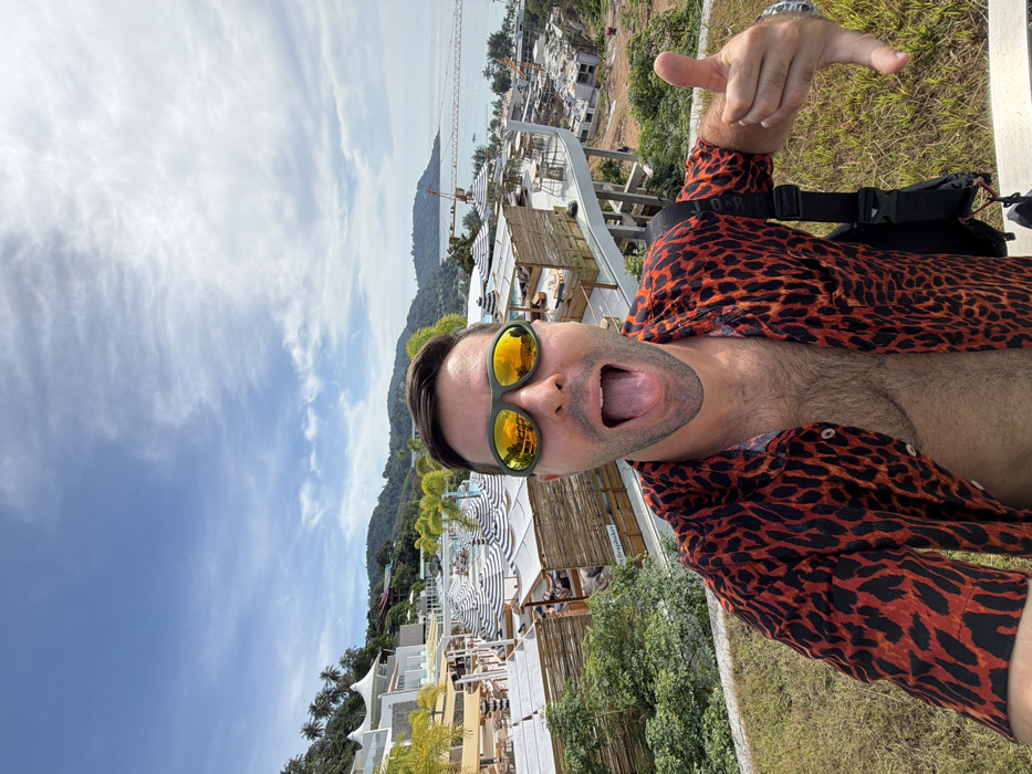 A man poses for a selfie wearing reflective sunglasses and an open, red leopard-print shirt. He's sticking out his tongue and making a hand gesture. Behind him is a coastal view with a beach club featuring white structures and striped umbrellas. Construction with a crane is visible in the background, along with hills and a partly cloudy sky. The photo is rotated.