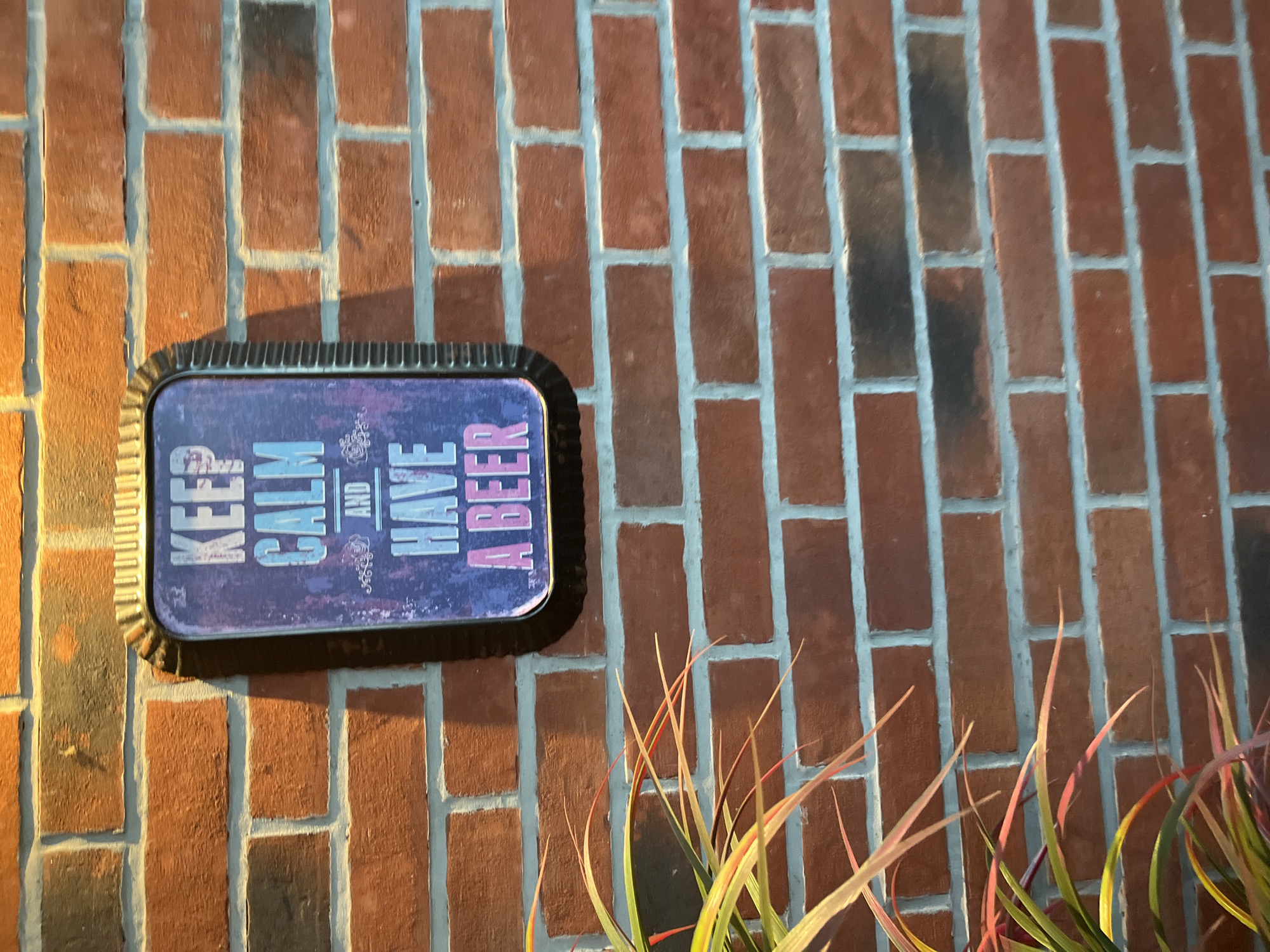 A medium, eye-level shot shows a brick wall with a sign that reads "Keep Calm and Have a Beer