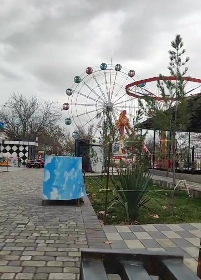 The video depicts a deserted amusement park on an overcast day. The park features a Ferris wheel with multicolored passenger cars, a spinning ride, and several other smaller rides and attractions, all of which appear to be closed. The ground is paved with gray brick and interspersed with patches of grass and young trees. In the foreground, there is a blue box covered with a cloud-printed tarp and a partially visible metal bench. The video is captured from a stationary perspective, providing a full view of the park's layout and vacant ambiance.
