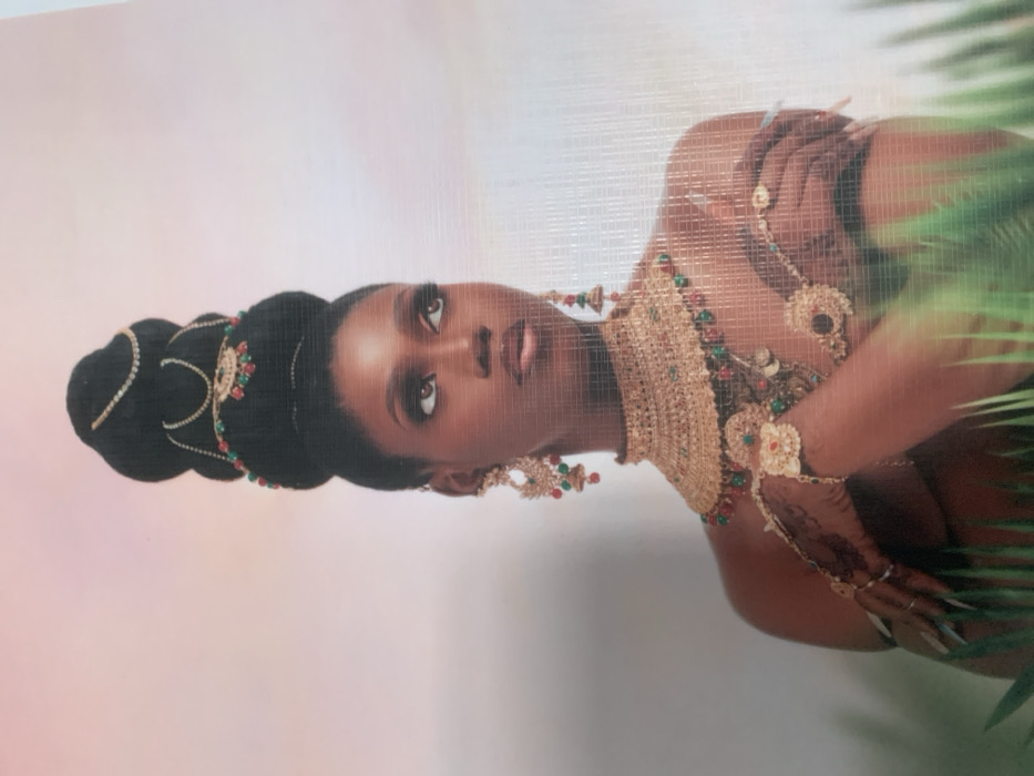 The image depicts a waist-up portrait of a dark-skinned female, presented as being located in Abuja, Nigeria, though no specific geographical markers are visible within the frame. The subject is positioned facing forward, with her head turned slightly to her right and her gaze directed upwards and to the right. Her arms are crossed in front of her chest, with her left arm crossing over her right. Her hair is styled in a tall, multi-tiered bun arrangement, adorned with gold-colored chains and red and green bead embellishments. She wears elaborate, gold-colored jewelry, including large chandelier-style earrings with red and green accents, a wide choker-style necklace featuring intricate patterns and similar red and green beads, and matching hathphool-style hand jewelry on both hands, connecting a bracelet to a ring with a central decorative motif. Her fingernails are long and manicured with a light polish. Dark, henna-like designs are visible on the backs of her hands. The upper body appears bare-shouldered. The background features a soft, gradient blend of light pink/peach at the top, transitioning to a paler tone lower down. The foreground contains blurred green foliage with narrow leaves, partially obscuring the lower portion of the subject's arms and torso.
