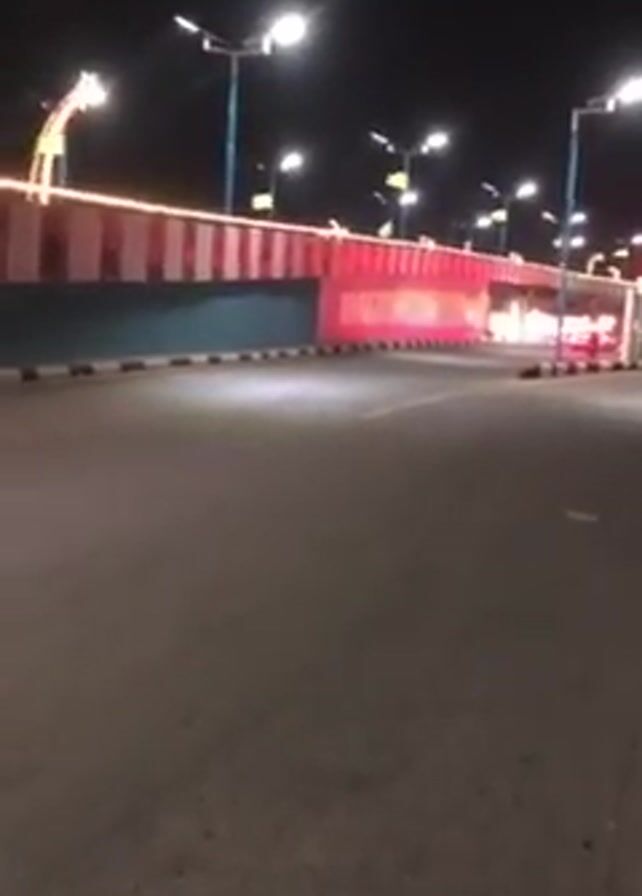 The scene depicts a nighttime shot of a roadway with streetlights illuminating the area. In the distance, a bridge or overpass structure is visible, adorned with colorful lights. A small blue van drives into the frame, passing in front of the viewer, then exits the frame to the left. The road surface is asphalt, and traffic is light. The overall lighting conditions are low, due to it being nighttime.