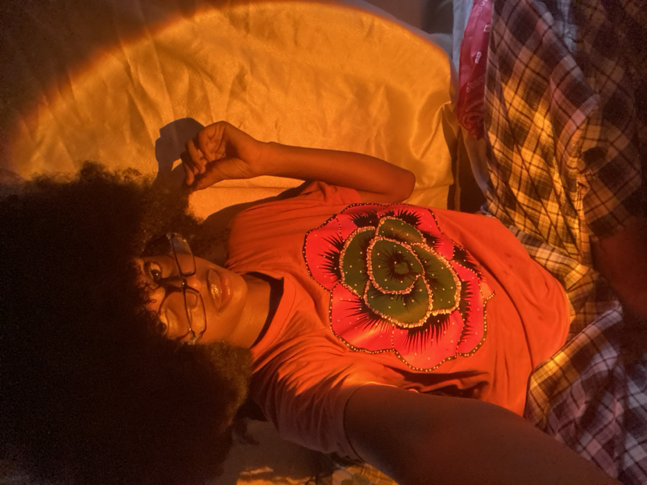 A person lies on their back, wearing glasses and an orange t-shirt with a large, ornate flower design. The flower features a red outline with green and silver embellishments. The person's dark hair is voluminous. A golden light illuminates the scene, creating a warm glow on the person and the background. A white sheet is visible behind the person, and a plaid pattern is present on the right side of the frame.