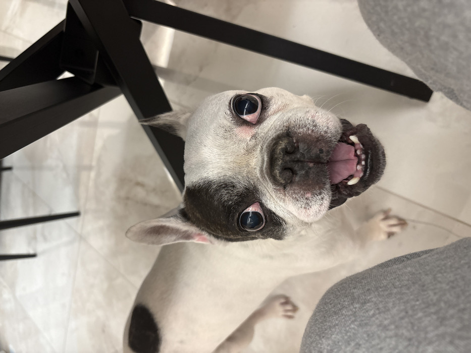 - "An indoor, low-angle photograph depicts a piebald French Bulldog-type dog looking directly upwards towards the camera" by FM-Qxeqi1, licensed under CC BY 4.0