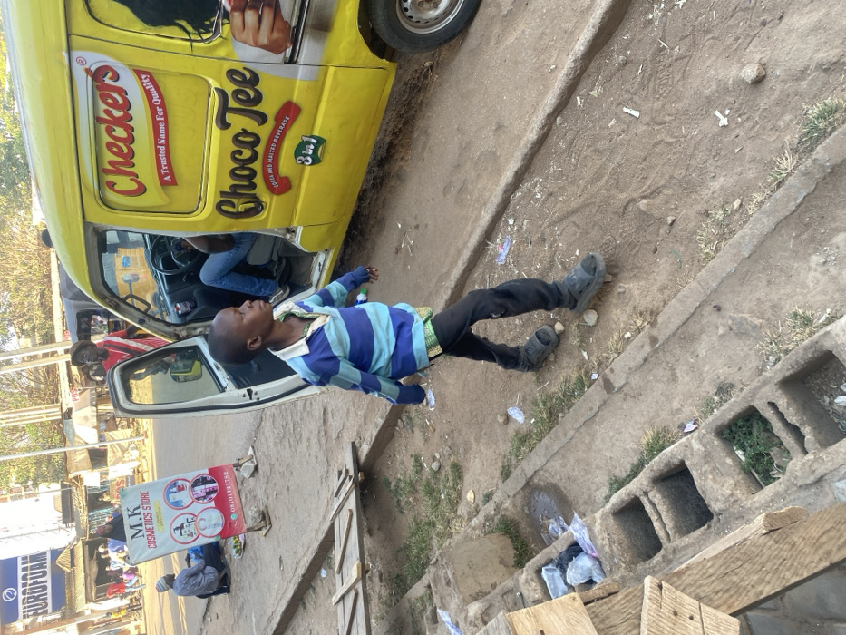 The image depicts an outdoor street scene in Kaduna South, Nigeria, under bright daylight conditions. In the foreground, a young Black male child, approximately 7-10 years old, walks from left to right across a dirt path. He wears a blue and light blue striped collared shirt, black pants, and dark grey open-toed sandals. His head is turned slightly to his right. To the child's right, a yellow commercial van is parked on the dirt shoulder. The van features "Checkers" and "Choco Tee" branding, identifying it as an "Accra and Malted Beverage 3 IN 1," with an illustration of a hand holding a cup. The passenger-side door of the van is open. Inside, the lower legs of a person wearing blue jeans are visible in the driver's seat. Standing near the open van door is another young Black male, wearing a red long-sleeved shirt. On the left side of the frame, a white A-frame sign for "M.K COSMETICS STORE," displaying cosmetic product images and a phone number (08101781750), stands on the dirt ground. Further left and in the background, a person wearing a light-colored garment is seated on the ground near a small display of items. The background reveals a busy street with several indistinct figures and various commercial buildings, one partially displaying "EUROFOAM" signage. The ground consists primarily of dry, light-brown dirt, with scattered litter including plastic bags and wrappers. A concrete drainage channel with multiple square openings runs along the lower left quadrant of the frame, containing some debris and sparse vegetation. Rough wooden planks are laid across a portion of this channel. A concrete curb or edge borders the dirt path on the right side. The scene is illuminated by direct sunlight, casting subtle shadows.