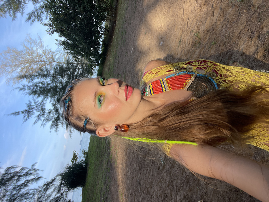 A woman lies on a sandy ground, facing the camera. She has long brown hair with a bright green braid and colorful beads. The woman wears green and yellow eyeshadow, reddish-pink lipstick, and large amber-colored earrings. She is adorned in a yellow crochet top and an elaborate, colorful necklace. Behind her are trees, grass, and a blue sky.