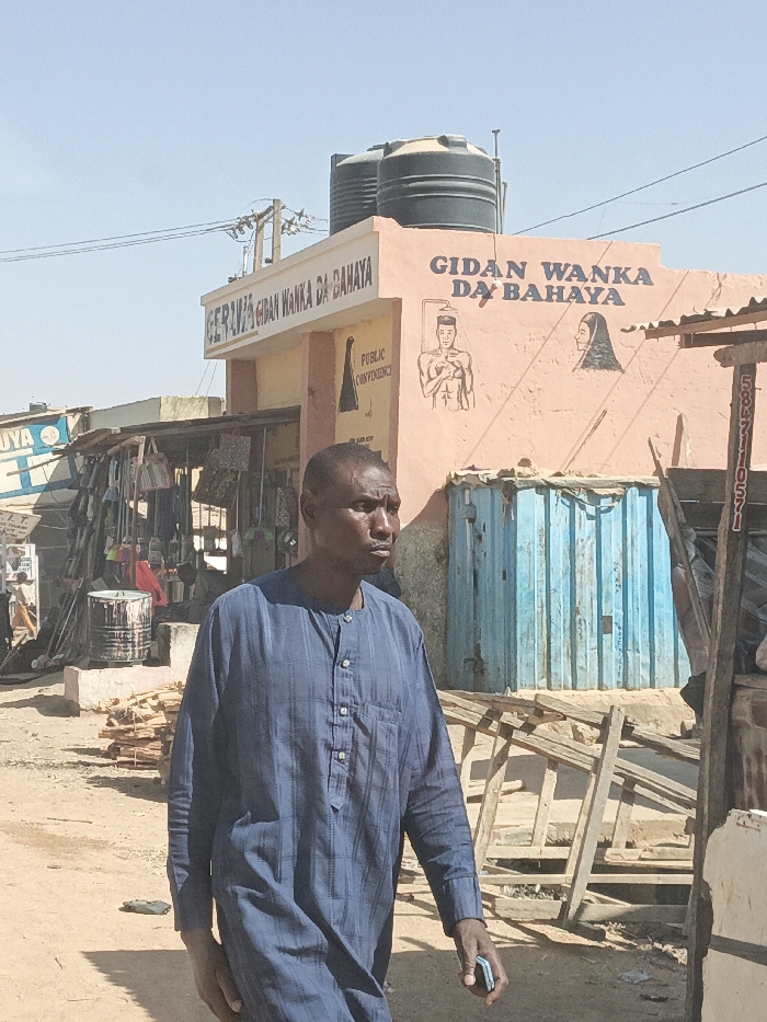This scene is located in Hotoro South, Nigeria. The image depicts an outdoor urban environment under clear, bright daylight. In the foreground, a man of dark complexion is walking towards the right, his gaze directed forward and slightly to the right. He wears a long-sleeved, collared blue garment with a subtle striped pattern and buttons down the chest. A light-colored object, possibly a mobile phone, is held in his right hand. A scar is visible on his forehead. In the midground, a light-pink building features dark blue lettering spelling "GIDAN WANKA DA BAHAYA" and "PUBLIC CONVENIENCE." The building's facade displays hand-painted illustrations: a shirtless male figure showering, a female figure wearing a headscarf, and a robed figure below the "PUBLIC CONVENIENCE" text. Two dark-colored water tanks are visible on the roof of this structure. To the immediate left of the pink building, an open-fronted stall displays various hanging goods. Below the pink building's illustrations, a faded blue corrugated metal structure is visible. The ground in the foreground and midground is unpaved and dusty, with scattered wooden planks and debris. Overhead power lines and a utility pole are present against a pale blue sky.