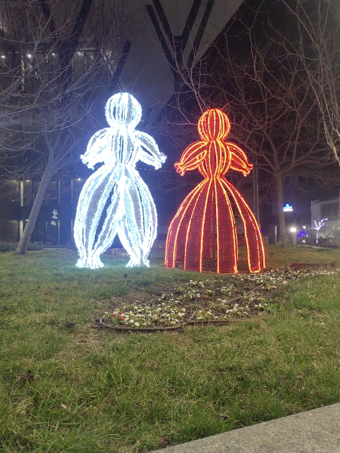 The image depicts a nighttime outdoor scene in a public green space within Nesebar, Bulgaria. Two large, stylized, illuminated festive figures stand on a grassy lawn. The figure on the left glows white-blue, presenting a humanoid form with a rounded head, stylized arms, and a wide, vertically-striped lower body. The figure on the right glows red-orange, mirroring the left in form, featuring a rounded head, stylized arms, and a full, vertically-striped skirt-like lower body. Both figures are constructed from light strips over internal frames. In the immediate foreground, a narrow bed of sparse small white and red flowers separates the lawn from the viewer, with a dark cable or hose lying across it. Behind the figures, several bare-branched deciduous trees are visible against a dark night sky. In the background, faint city lights illuminate distant structures, and prominent dark, angular architectural elements, one forming a distinct 'V' shape, rise above the trees.
