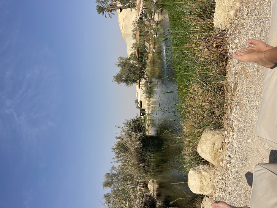 The image captures an outdoor recreational area, likely a desert oasis or resort, within the Arava Tichona Regional Council, Israel, under a clear blue sky. In the immediate foreground, two human feet are visible, resting on a light-colored cushioned surface. The right foot features two toe rings (on the second and third toes) and a thin ankle bracelet. The ground beneath the feet consists of light-colored gravel and scattered larger stones. Beyond the immediate foreground, a tranquil body of water, resembling a pond or small lake, occupies the midground. Its surface reflects the blue sky, and dense green and brown reeds and vegetation line its banks, particularly on the left. A small water aerator or fountain is visible on the right side of the water, creating minor ripples. In the background, across the water, several low-rise buildings with light-colored walls and dark roofs are present. Adjacent to these structures, multiple vacant lounge chairs are arranged beneath brown-canopied umbrellas. Further in the distance, a prominent light-colored desert mountain or hill range rises on the right side of the frame, with a single palm tree visible nearby. The scene is brightly illuminated by direct sunlight, indicating a clear day.