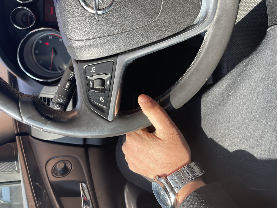 The image depicts the interior of a vehicle, specifically the driver's perspective, located in Lesidren, Bulgaria. A tanned human left hand, adorned with a silver-toned metallic wristwatch, is positioned on the lower-left portion of a dark-colored, worn steering wheel. The steering wheel exhibits visible peeling of its surface material on the upper-left segment. Integrated controls for cruise control or infotainment are visible on the left spoke of the steering wheel, featuring 'RES/+' and 'SET/-' buttons, along with a 'MENU' control and an unidentified icon. The central airbag cover features a chrome Opel logo. Behind the steering wheel, a dark dashboard and instrument cluster are partially visible, showing a speedometer with a red needle at or near zero, an illuminated red warning light, and a digital display indicating 'Speed'. A stalk control is visible to the left of the steering wheel. The vehicle's dark-colored door panel, with a chrome handle and a circular control knob, is visible on the left. Bright sunlight illuminates the scene, casting distinct shadows from the hand onto the dark fabric of what appears to be the driver's leg, clad in dark trousers or track pants.