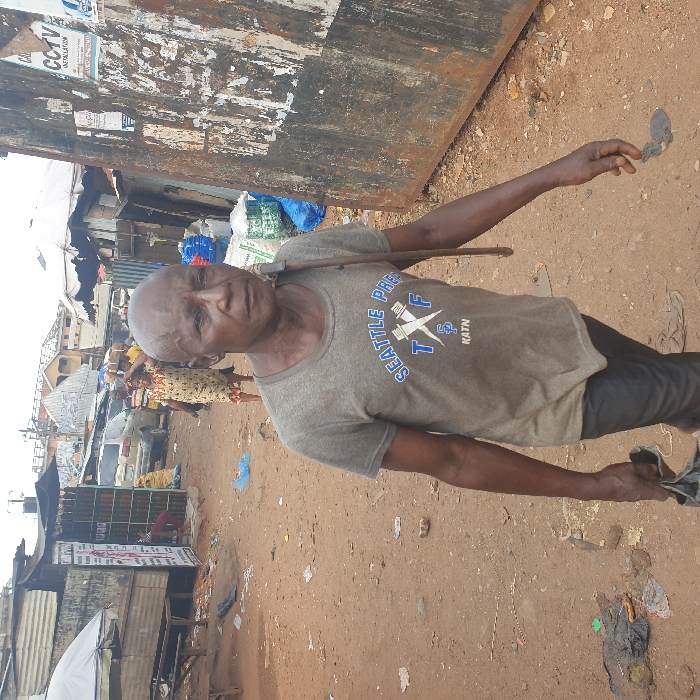 This image depicts an unpaved market street in Onitsha, Nigeria, under an overcast sky. In the foreground, a bald, dark-skinned adult male, appearing middle-aged or elderly, walks towards the viewer. He wears a faded grey short-sleeved t-shirt with "SEATTLE PREP TXF KAIN" printed in blue and white, and dark trousers. He carries a dark plastic bag in his left hand and has a dark, slender, stick-like object resting on his right shoulder. His gaze is directed slightly to the left of the camera. The ground is reddish-brown dirt, uneven, and strewn with litter, including plastic bags and various debris. To the left of the main subject, a makeshift stall with a corrugated metal roof, a white fabric awning, and a visible wooden table is present. To the right, a large, dark, rusted metal panel or gate stands vertically, displaying faded posters, one of which contains the text "CCTV" and other illegible information. In the mid-ground, blue and white sacks, possibly containing goods, are stacked against structures. Further down the street, several individuals are visible, including a woman in a light-colored, patterned dress walking to the left. A light-colored SUV is parked or moving in the distance. The background features various other makeshift stalls, corrugated metal structures, and multi-story buildings with corrugated roofs, consistent with a bustling urban commercial area.