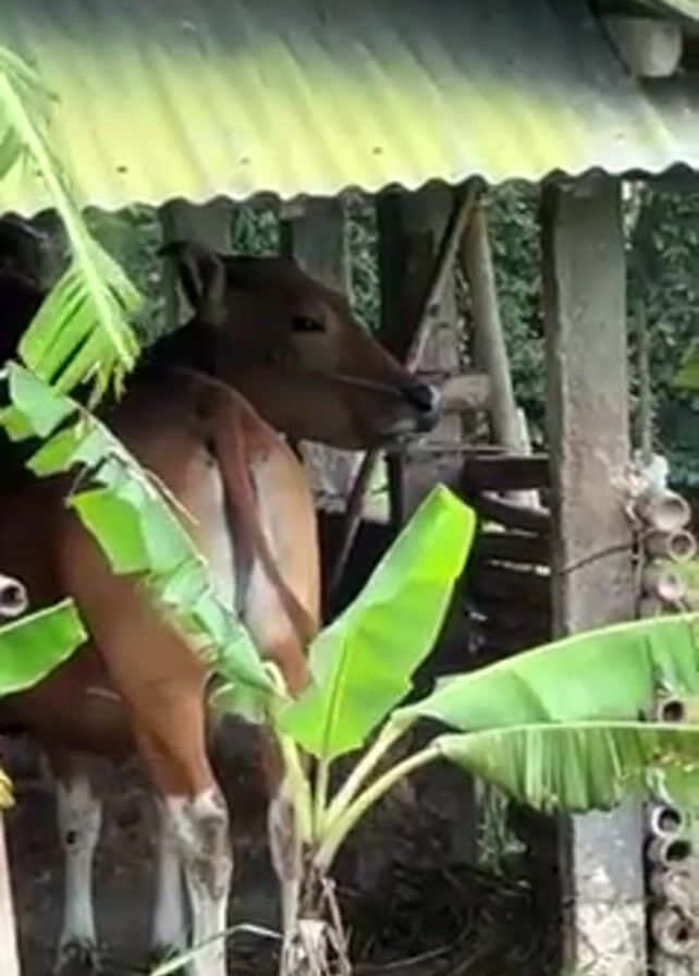 cow standing under a tin roofed shelter in a rural environment. The cow is brown and white, and appears to be tied to the shelter. The shelter is surrounded by green grass and banana plants. In the background there are rice paddies and a mountain range. The sky is cloudy.