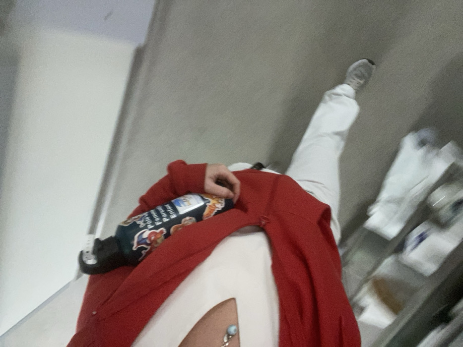 The image displays a partial view of one individual in an indoor hallway, likely within the Centre Hospitalier de Tourcoing, France. The person is in motion, captured from a high angle, looking generally towards the right of the frame. They are wearing a red long-sleeved top or jacket, open to reveal a white undershirt with a silver necklace featuring a light blue pendant. White trousers and grey athletic shoes with white soles are visible on their lower body. In their right hand, they hold a dark-colored water bottle equipped with a black flip-top lid and adorned with several stickers, including a prominent one stating "Pôle Femme Parent Enfant." The immediate environment features a uniform light grey floor and a plain light-colored wall with a horizontal line. The lower-left foreground contains blurry elements resembling a medical trolley or shelving unit with white packaged items.