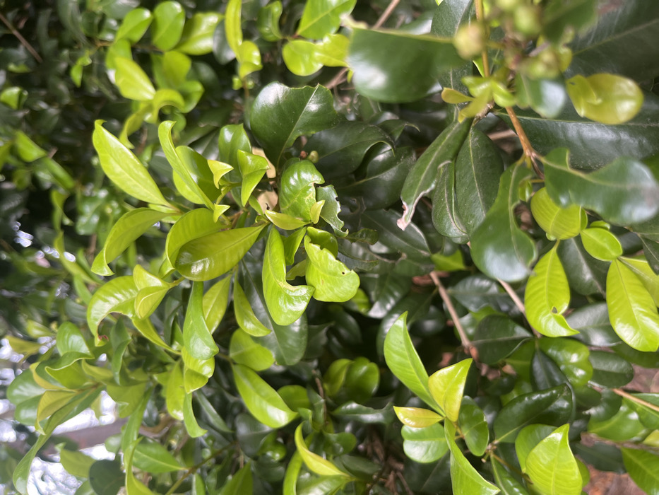 Lush green leaves fill the frame, varying in shade from bright lime to deep forest. Some leaves are smooth and rounded, while others are more elongated. The leaves are densely packed, creating a vibrant and textured scene. Hints of branches can be seen weaving through the foliage, adding depth to the composition.