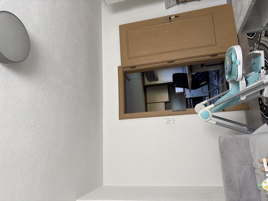 This image depicts an interior residential scene located in Feldkirch, Austria, observed from a living area looking towards a kitchen or dining space through an open doorway. In the foreground and midground, a portion of a gray, ribbed sofa or couch is visible on the left. Centrally positioned is a light blue and gray infant high chair with an attached tray. The tray holds a light blue bowl containing yellow contents, consistent with food. To the right of the high chair, a partial view of a low, gray-toned coffee table is present. The floor underneath the high chair is covered by a patterned rug featuring black, white, and gray geometric designs. On the white, textured wall to the left of the doorway, a light-colored wall switch or outlet combination is affixed. A light brown wooden door frame leads into the adjacent room. A matching light brown wooden door is open at an angle into the foreground, revealing parts of the room beyond. The door features recessed panels, hinges, and a brass-colored handle. Through the doorway, elements of a kitchen or dining area are visible. These include light-colored wooden upper and lower cabinets, a silver microwave oven positioned on a counter, and a dark stovetop unit with visible control knobs. A black office-style chair with wheels is tucked under a light-colored wooden table or countertop. A dark gray cylindrical pendant light fixture hangs from the ceiling in this background room. The ceiling throughout the depicted space is white and textured. A gray circular flush-mount ceiling light fixture is visible in the upper right quadrant of the image. The walls are predominantly white and have a textured finish. No individuals are present in the scene.