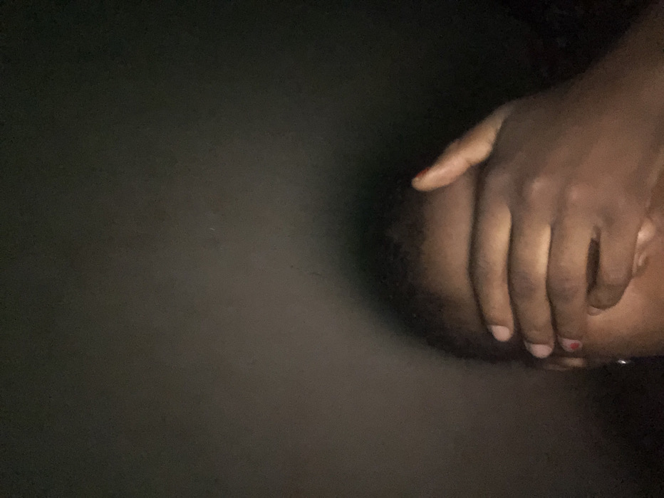 A dark-skinned hand rests on a knee, seemingly in a dimly lit or dark environment