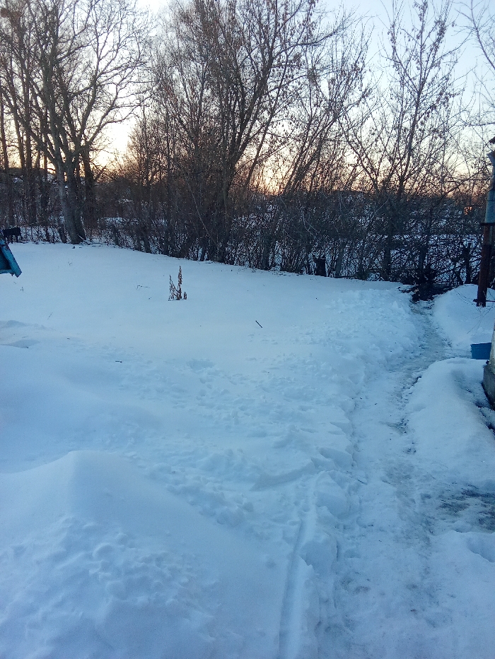 A snow-covered landscape under a light sky. Bare trees and shrubs line the horizon, tinged with a hint of sunset. A snow-covered path leads from the right edge of the frame, cutting through the deep snow cover. Irregular snowdrifts and footprints mark the terrain, indicating human activity. A few sparse weeds poke through the snow near the center of the scene.