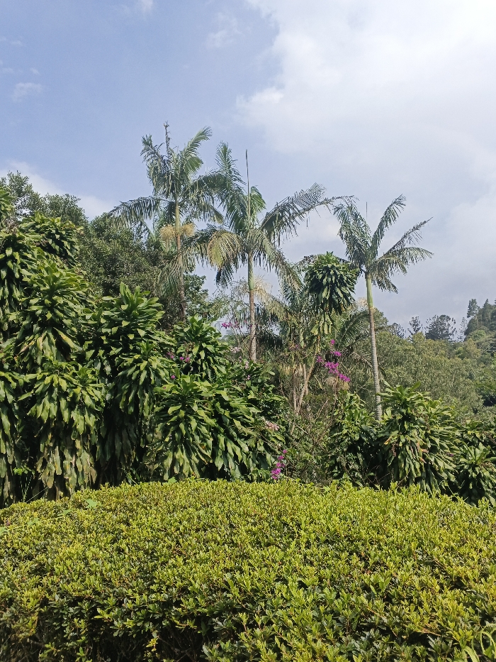 The image presents a densely vegetated outdoor scene in Baglung, Nepal, under a partially cloudy blue sky. The foreground features a meticulously trimmed hedge composed of small, light-green leaves, spanning the width of the frame. Behind this hedge, a thick stratum of broad-leaved, dark-green foliage plants, possibly *Dracaena* or similar species, forms a dense wall. Scattered clusters of small purple flowers are visible amidst this midground vegetation. Rising above are several tall palm trees, characterized by their slender trunks and radiating fronds. Further in the background, a verdant hillside or dense forest composed of various tree types is visible. No human figures, animals, or man-made structures are present.
