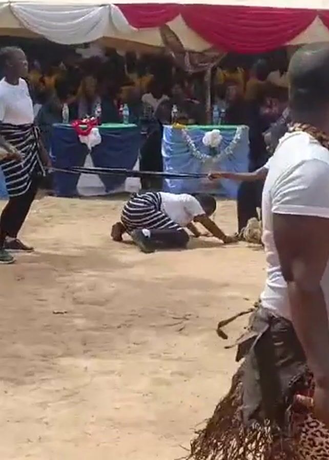 A wide shot shows a sandy area with a crowd of people gathered around a performance space. A white tent is visible in the background, along with several people standing and seated in front of it. To the left, there is a table covered with a yellow and white cloth. The main focus of the scene is a group of performers. One person, dressed in a white shirt, leopard-print scarf, and fringed pants, stands facing away from the camera. Another person is kneeling on the ground, appearing to be performing some kind of ritual or dance. Two other individuals, one holding a large black strap and the other a bundle of grass, are also involved in the performance. Another individual in the foreground films the performance with a smartphone. The camera zooms in on the performer kneeling and the individuals holding the strap and grass. The kneeling performer is wearing a white shirt and striped pants. The person holding the strap is wearing a white shirt and striped pants as well, while the person holding the strap is wearing a white soccer jersey. The performance takes place in front of a group of people sitting behind tables decorated with blue and white cloths.