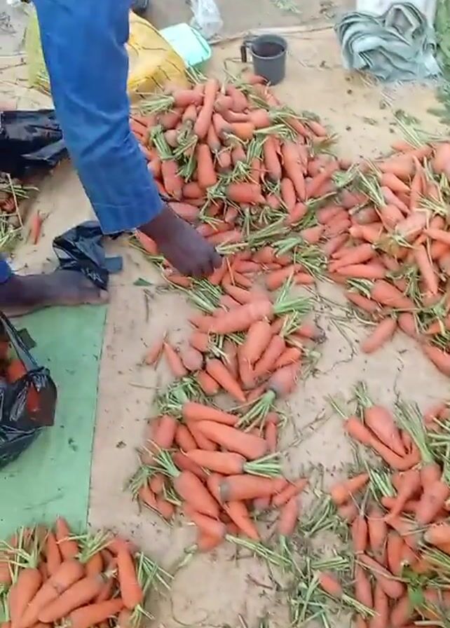 n open-air market. Piles of carrots are spread on the ground. People are selecting and putting carrots into plastic bags. Other vegetables such as onions and green onions are also visible. The ground is covered with assorted debris, including carrot tops. Several people are walking around, some are barefoot, and some are wearing sandals or shoes. The surrounding area is active with people and vehicles.