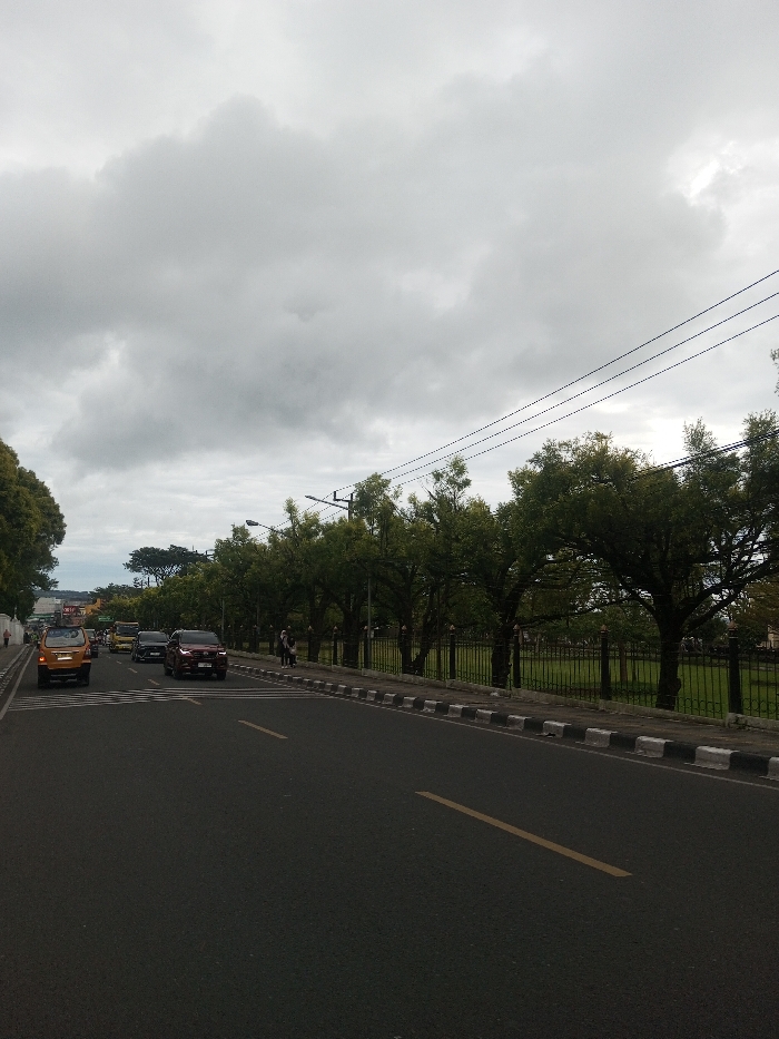 The image depicts a street scene in the city of Sandamal Eliya, Sri Lanka, under a uniformly overcast sky. A dark asphalt road, featuring a solid yellow center line and broken white lane markings, occupies the lower half of the frame. Traffic is present on both visible sides of the road. On the left, a yellow taxi-like vehicle leads a line of vehicles, including a dark SUV and a yellow bus, moving away from the viewer. On the right, a dark red SUV and another dark sedan are positioned on the roadway. A pedestrian crossing is visible in the mid-ground. A black and white striped curb delineates the right edge of the road, bordering a narrow sidewalk. Two individuals are standing on this sidewalk near a row of densely leaved green trees that runs parallel to the street. Behind these trees, a black metal fence encloses a flat expanse of green grass. Multiple utility poles with several dark overhead power lines are visible above the trees and fence, extending across the upper right quadrant of the image. Streetlights are also discernible among the trees. Buildings are partially visible in the distant background on the left side.