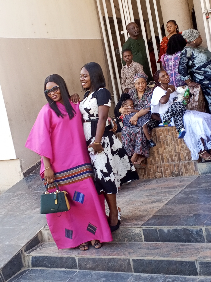 The image captures a gathering of multiple individuals, primarily women and children, positioned on and around a tiled staircase and a raised platform outside a building in Sabon Gari West, Nigeria. In the foreground, two adult women stand on a dark-tiled surface. The woman on the left wears a bright pink kaftan-style garment adorned with horizontal stripes in brown, blue, red, and white, as well as rectangular blue and dark patches near the lower hem. She has dark hair, wears sunglasses, and is smiling faintly, carrying a dark green handbag with yellow accents in her left hand. Her right hand rests on the shoulder of the woman to her right. This second woman wears a black dress featuring a prominent white floral pattern. She has short dark hair, smiles broadly, and looks towards the first woman, with her left hand resting on the first woman's shoulder. Behind them, on a staircase and raised platform constructed from reddish-brown rectangular tiles, approximately ten additional individuals are visible. An older woman, dressed in a patterned garment and headwrap, is seated and cradles a baby or toddler clothed in a polka-dot outfit. Nearby, another woman in a white top and patterned trousers is seated, holding a green plastic bottle. A small child is seated next to her. Other individuals, predominantly women in various patterned traditional attire and headwraps, are seated or partially visible on the platform. In the upper background, an older man in a green shirt stands and looks upward, with a young boy in a patterned shirt positioned slightly in front of him. A woman in an orange top is partially visible behind the boy. The background on the left consists of a plain light-colored building wall, while white vertical metal bars, suggesting a gate or railing, are visible behind the upper group on the platform. The ground in the immediate foreground and the staircase steps are covered with dark grey-brown tiles.