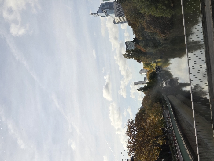The image captures a panoramic view from a bridge over the Seine River in Neuilly-sur-Seine, France, looking towards the La Défense business district. A metallic bridge railing spans the lower portion of the frame, with a dark surface immediately below it. To the left, a paved road or pathway, bordered by a green barrier, runs parallel to the river. This path is lined with deciduous trees displaying yellow and orange autumn foliage; an ornate black lamppost is visible among these trees. The Seine River occupies the central midground, reflecting the sky and surrounding vegetation. Several houseboats are moored along the river's right bank, which is densely covered with trees showing a mix of green and autumnal leaves. In the background, the skyline of La Défense is visible, characterized by multiple modern skyscrapers, including a distinctive tall, pointed structure on the far right. The sky above is light blue with scattered white cumulus clouds and two visible aircraft contrails. No people are discernible.