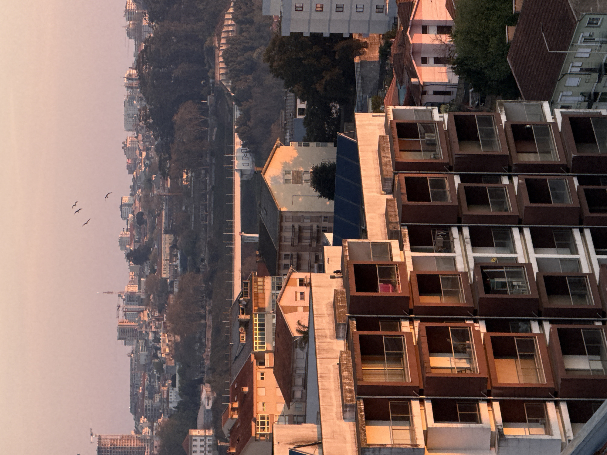 The image presents an urban landscape in Vila Nova de Gaia, Portugal, under the soft, warm light of either sunrise or sunset, creating a pervasive pinkish-orange hue. In the foreground, a multi-story residential building dominates the lower left and central frame. This structure features light-colored main facades contrasting with an arrangement of prominent, dark brown, cuboid-shaped balcony units. Each balcony is equipped with a transparent barrier and a metallic railing. Inside some balconies, faint details such as a pink garment and interior furnishings are discernible. To the immediate right and below this building, terracotta and brown tiled roofs of adjacent structures are partially visible. The midground comprises a dense cluster of diverse residential and commercial buildings, exhibiting varying architectural styles and roof colors, primarily shades of red, brown, and yellow. Patches of dark green foliage are scattered among these structures and on elevated terrain. A long, light-colored bridge, consistent with concrete construction, spans horizontally across the middle distance. To the far right, a tall, light-grey building with multiple rectangular windows is visible. The background extends to a hazy horizon line featuring rolling hills densely covered with dark green trees. Beyond these hills, a sprawling cityscape is evident, characterized by numerous buildings of varying heights, including taller structures and several visible construction cranes. The sky above maintains a gradient of pale pink to light orange. Five small, dark bird silhouettes are captured in flight across the upper sky, primarily in the upper left quadrant. No discernible human figures are present.