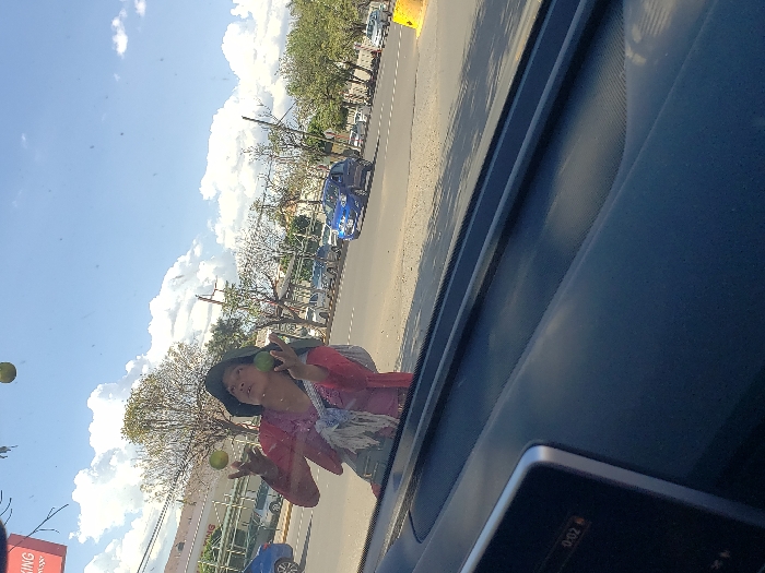 A woman juggling limes stands on a street corner. She wears a hat and a red shirt. Cars are parked along the street. The image is taken from inside a vehicle, with the dashboard visible in the foreground. The sky is bright blue with fluffy white clouds. Trees line the road. A building with "KING" in red letters is partially visible. The scene is captured during the day.