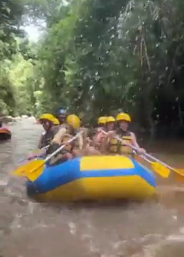 A water-level, wide shot shows a group of five people in a blue and yellow raft traveling down a river between lush green trees. The people are wearing yellow helmets and life vests and are using yellow paddles to navigate the river. The water is murky brown. Another raft with a similar group of people is visible in the background. The camera is facing forward, capturing the raft’s journey down the river.