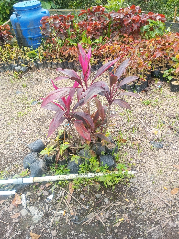 The image depicts an outdoor plant cultivation or nursery area located in Cibodas, Indonesia. The central foreground features a plant with multiple stems and elongated leaves in shades of deep red and purple. Immediately surrounding its base and extending into the midground are numerous smaller plants, each contained within individual black plastic polybags arranged on the ground. In the upper left background, a large, weathered blue plastic barrel with a lighter blue lid is present. The background also contains a dense array of various foliage, including plants with green leaves and others displaying red-brown coloration, consistent with nursery stock. The ground surface consists of light brown, granular soil mixed with scattered pebbles, dried organic matter, and several discarded cigarette butts. A segment of white PVC piping runs horizontally across the lower foreground, partially obscured by sparse green weeds. No individuals or active human interventions are visible.