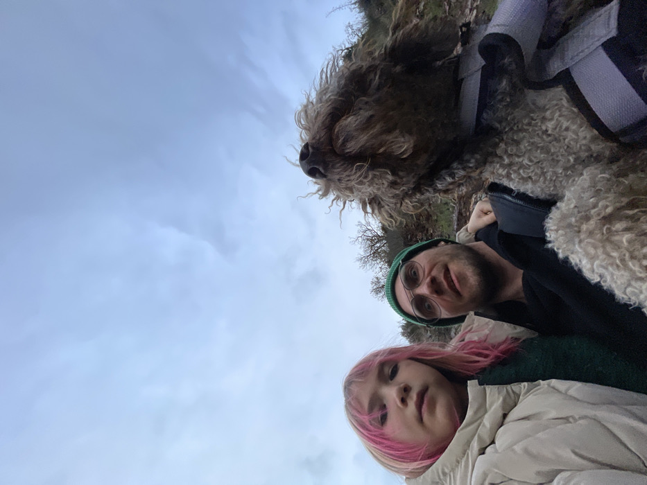 A selfie-style image shows a curly-haired dog wearing a harness, a man with a green beanie and glasses, and a young girl with pink-streaked hair against a cloudy sky. The dog is positioned at the top of the frame, with the man and girl below. The angle is tilted, giving a unique perspective. The background consists of trees and a cloudy sky.