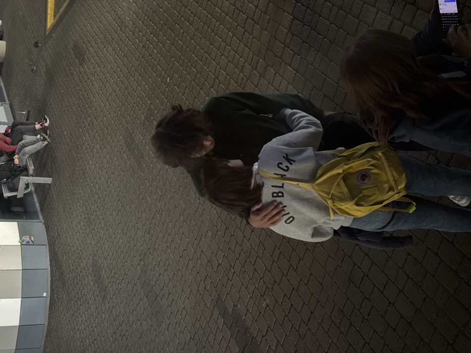 The image depicts an outdoor urban scene in Poznan, Poland, under low light conditions, likely evening. The foreground is dominated by three individuals. A central couple is embracing; the female subject, with short dark hair, wears a grey sweatshirt with "ONLY BLACK" text across the back, blue jeans, and a yellow Fjallraven Kanken backpack. Her left arm is around the male subject's waist. The male subject, with dark, curly, medium-length hair, wears a dark green long-sleeved shirt and dark pants; his right arm is around the female's shoulders, and his head is tilted downward toward her. To the right, partially visible in the lower foreground, a third individual with long, reddish-brown hair is observing a smartphone with an illuminated screen, held with both hands. The ground surface is covered with dark, rectangular paver blocks. In the background, to the left, a building corner features a two-tone grey and white paneled facade. Adjacent to this structure, two additional individuals are seated on a minimalist metal bench. The person on the left wears grey pants and a dark top; the person on the right wears dark pants and a red top. Several dark, small bird-like figures, possibly pigeons, are visible on the paved ground in the mid-background. Shadows are present, indicating a light source not directly within the frame.