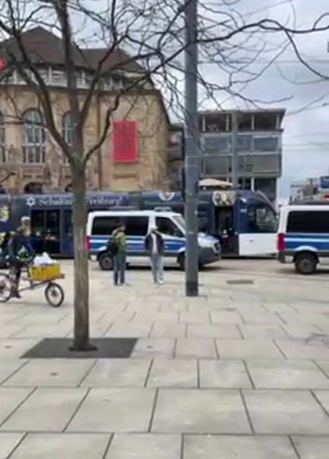 city square on an overcast day, with several police vans and a tram. Two people are standing near the first police van, and a person rides a cargo bike carrying a yellow container. A couple walks across a crosswalk as police officers stand near a tram. The square is paved with large square tiles, and there are trees with bare branches and several buildings in the background. The sky is gray.