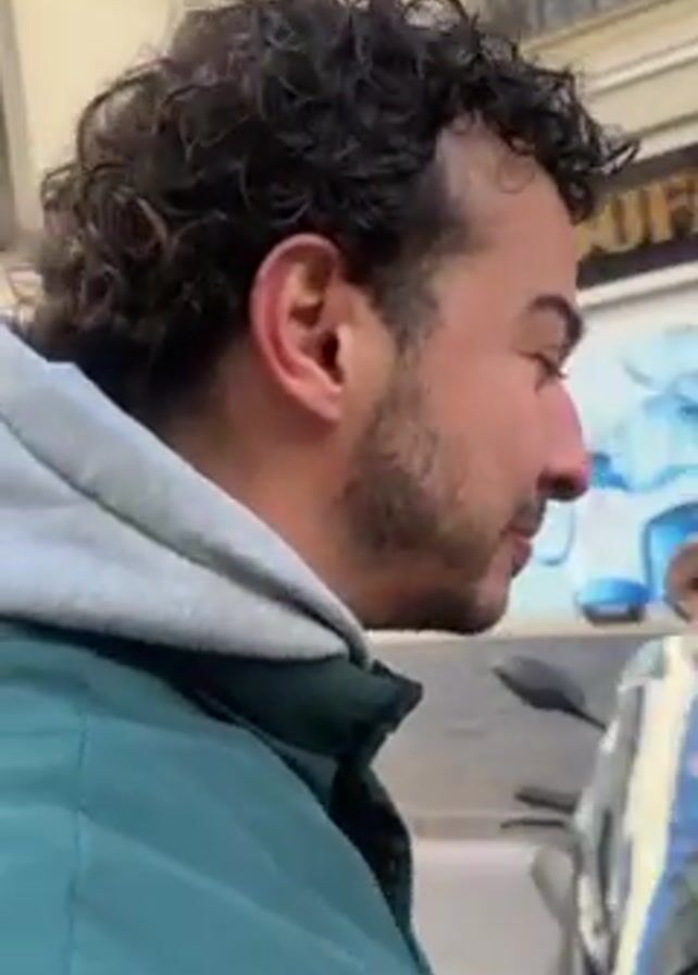 A man with curly dark hair, wearing a green puffer jacket over a gray hooded sweatshirt, is walking down a sidewalk holding a lit candle