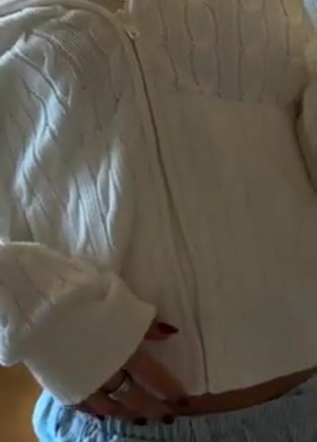 A person wearing a white cable-knit zip-up hoodie, a white tank top, and light blue striped corduroy pants is shown from the chest down. The person puts their hand in their right pocket.