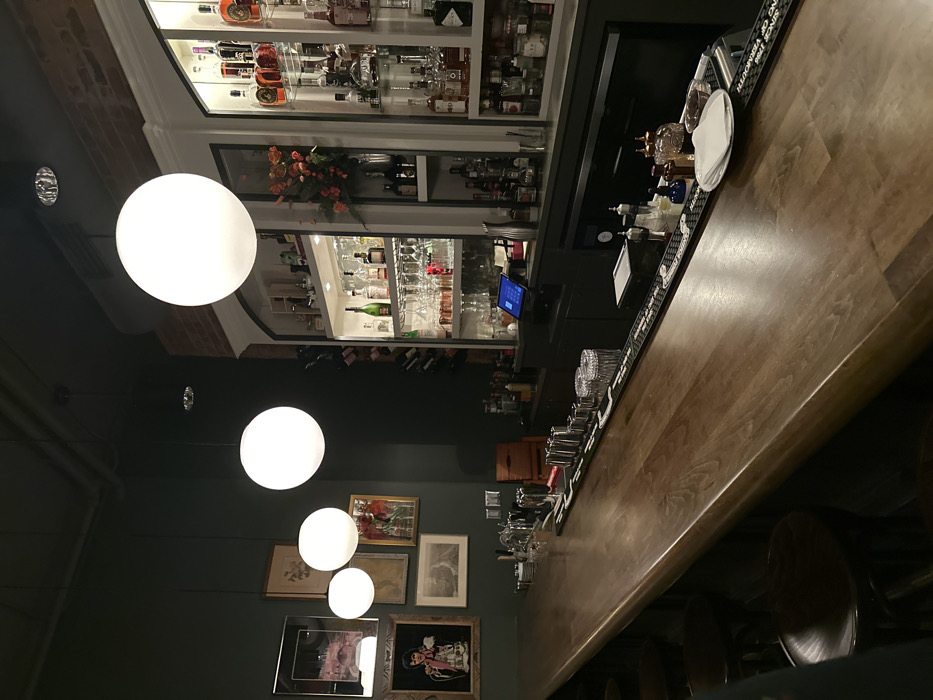 A bar showcases a well-stocked back wall of liquor and glassware. A wooden bar top stretches into the foreground with glassware, bar mats, and drink taps visible. A series of round pendant lights hang from the ceiling and illuminate a wall displaying framed artwork. Bar stools can be seen along the bar's edge.